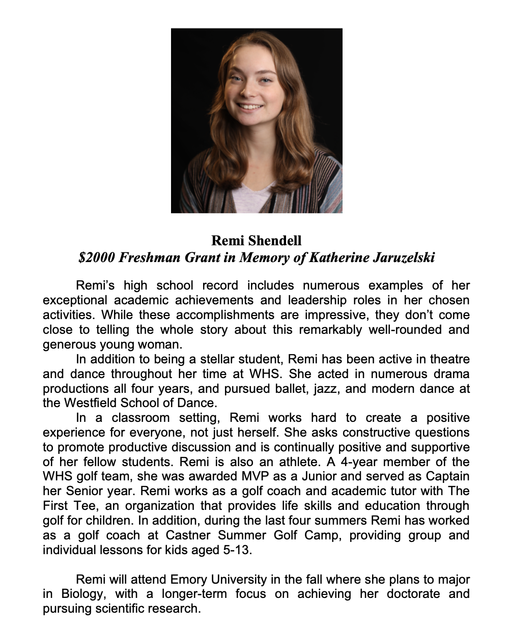 - Remi Shendell $2000 Freshman Grant in Memory of Katherine Jaruzelski; Planning to major in Biology and will attend Emory University.