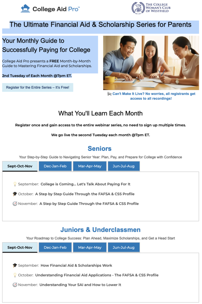 is proud to offer free financial aid and scholarship series for parents. Click on the link to register.