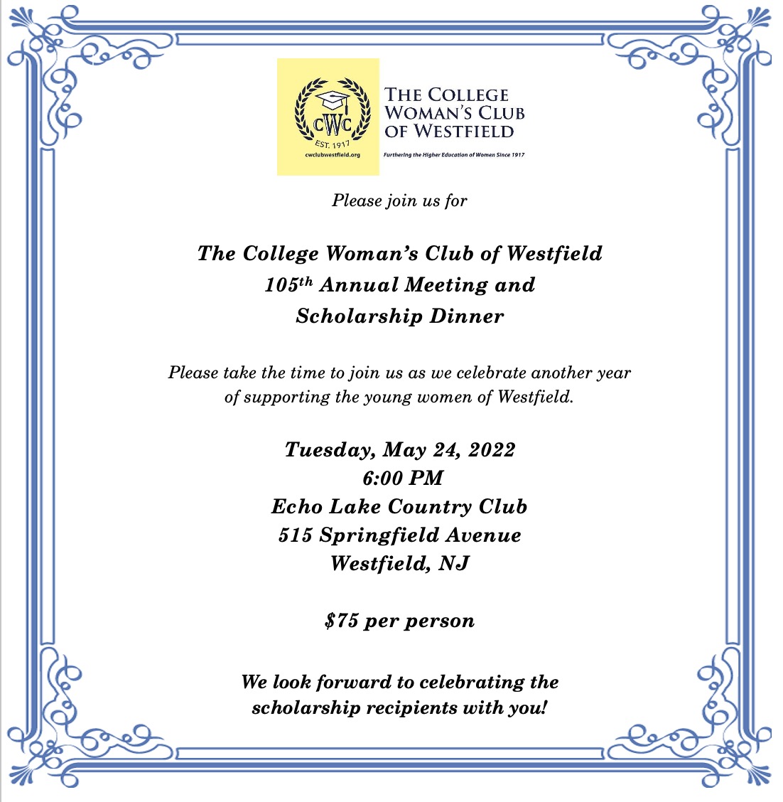 Please join us in celebrating the accomplishments of these young women at our 105th Annual Meeting and Scholarship Awards ceremony on Tuesday, May 24th at 7pm, to be held at the Echo Lake Country Club in Westfield. The event is $75.00 per person and includes dinner.